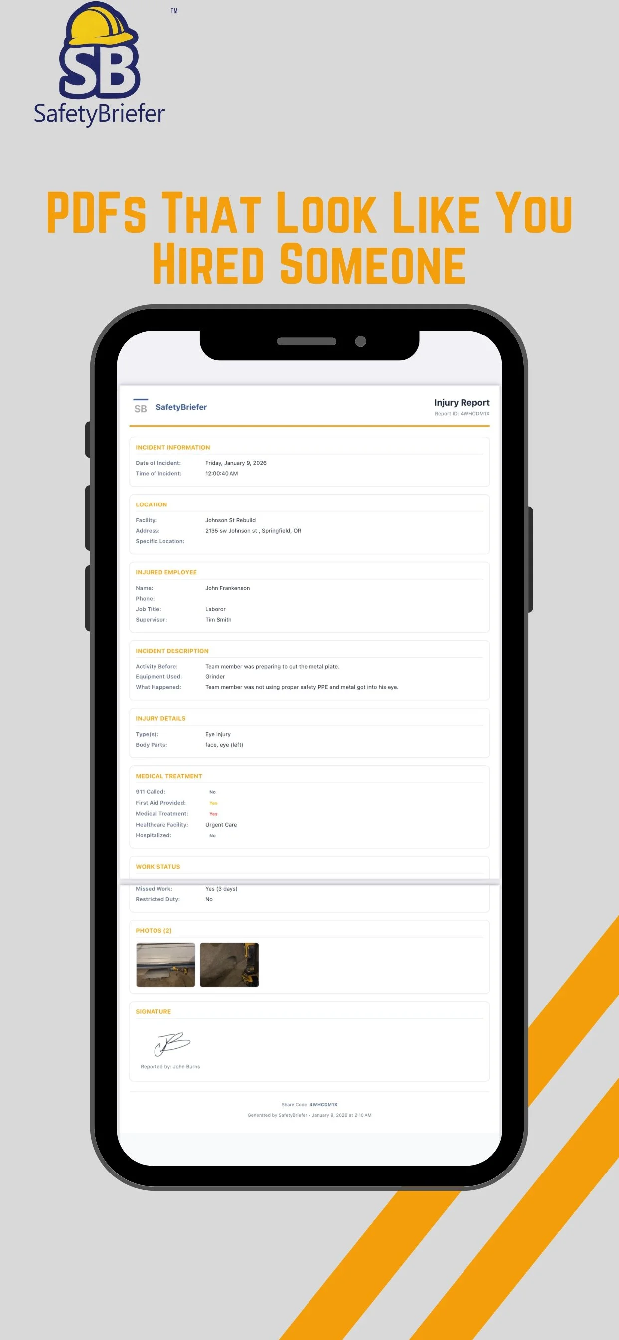 When something happens, paperwork matters. SafetyBriefer™ includes professional templates for the reports you need—ready to fill out on the spot, not scrambled together after the fact.