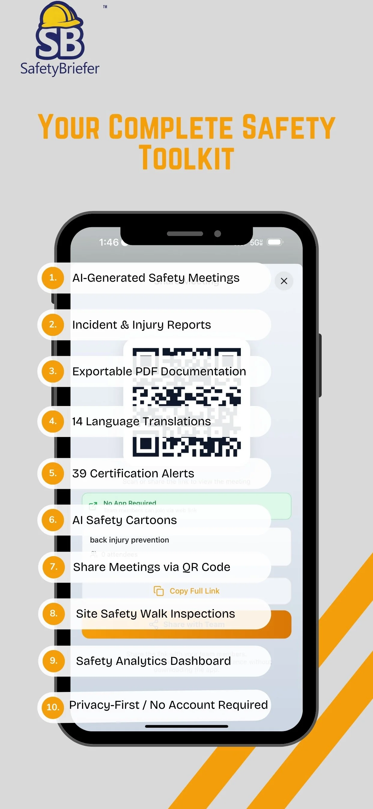 A safety meeting doesn't work if half your crew doesn't understand it. SafetyBriefer™ translates every briefing into 14 languages instantly. Share via QR code and everyone views the same meeting in their preferred language.