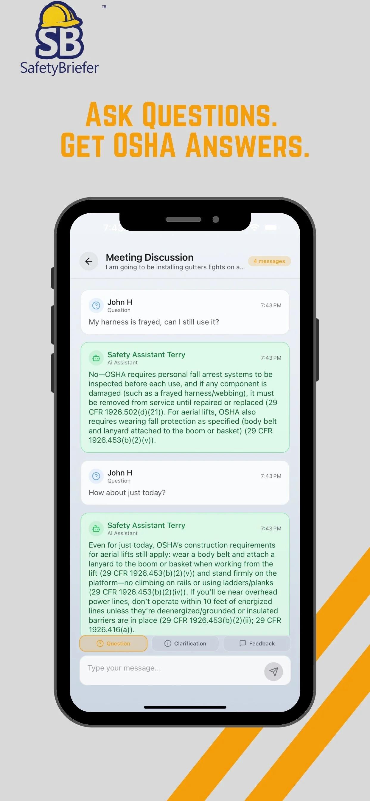 A good safety meeting isn't a lecture—it's a conversation. Every SafetyBriefer™ meeting includes rotating discussion questions designed to engage your crew and get them thinking about the hazards they're about to face.